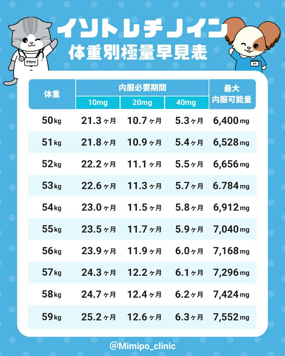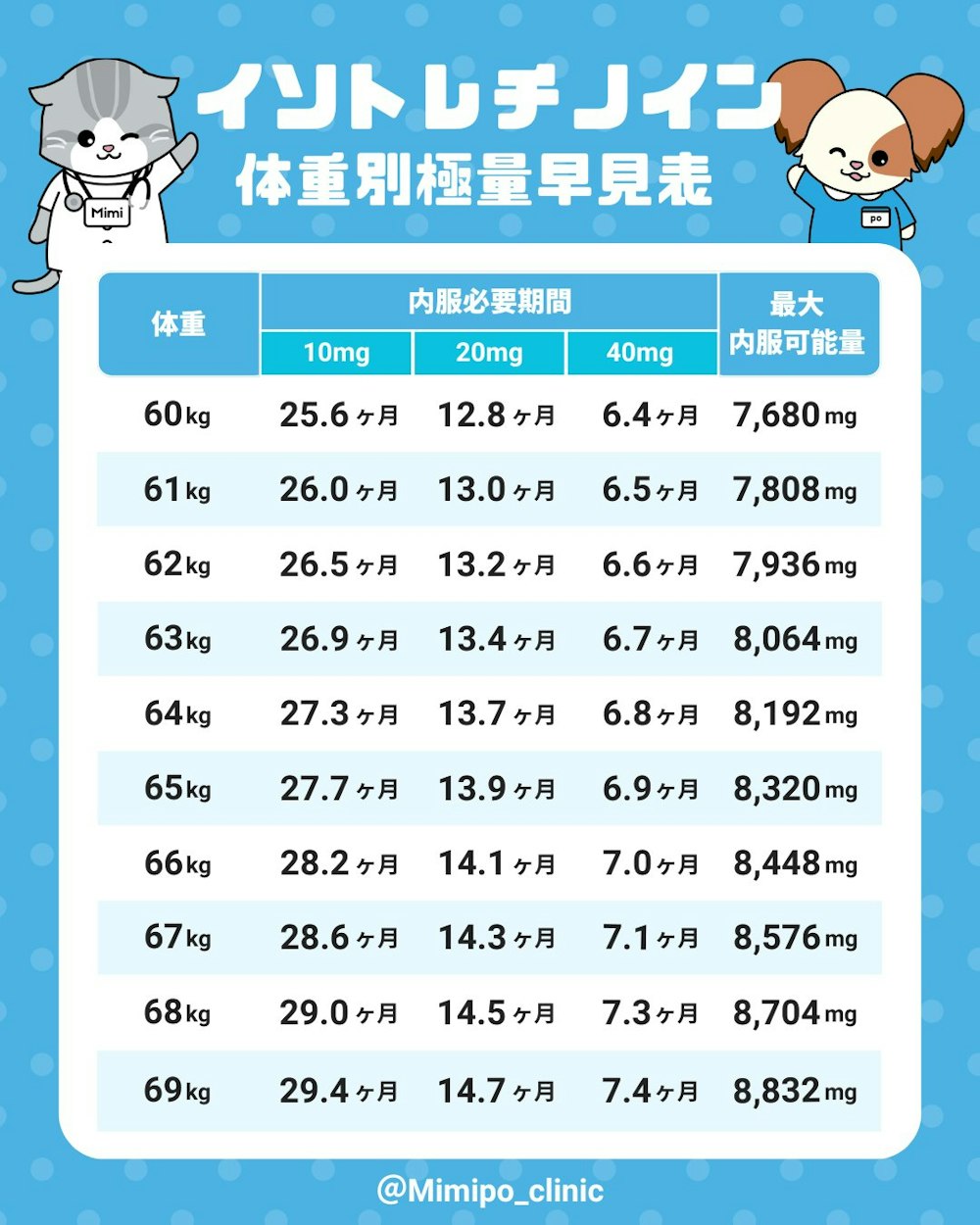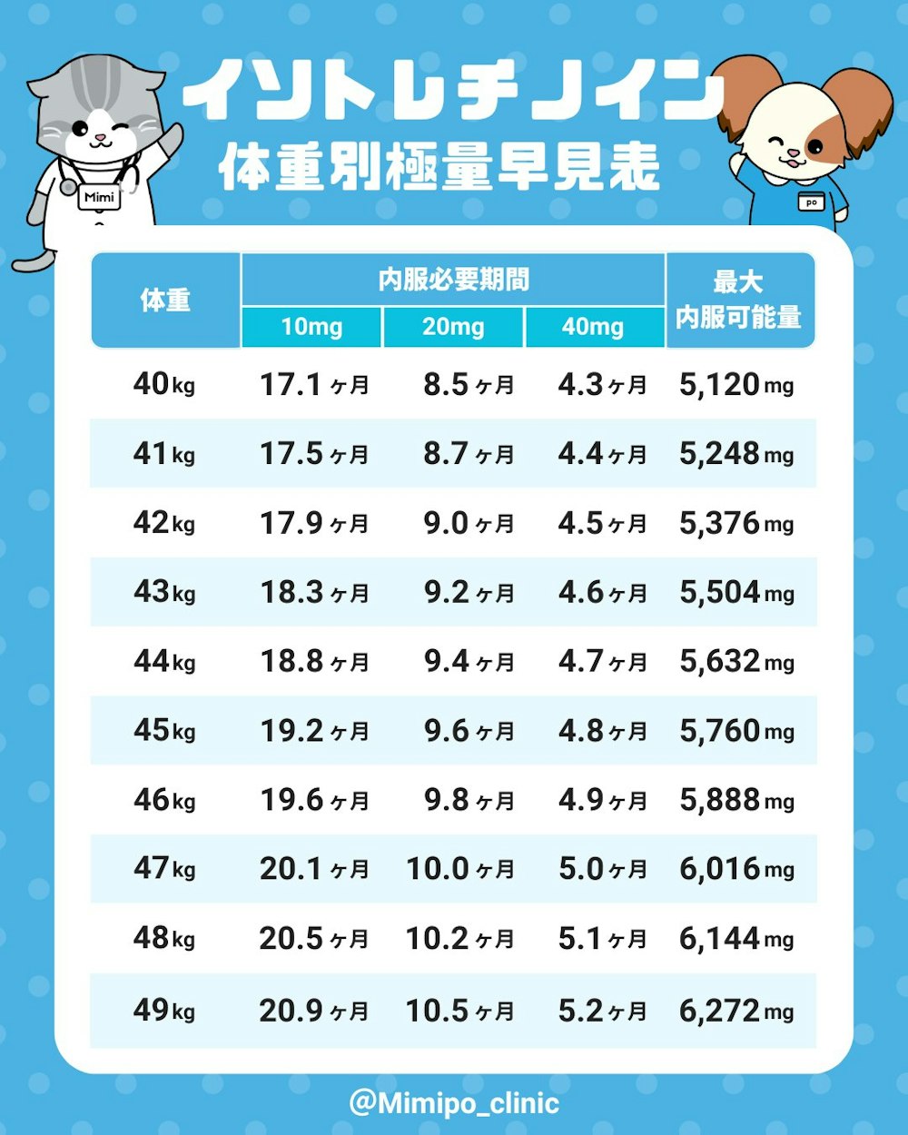 Mimipoで使用しているオリジナル「体重別最大積算量表」もご紹介します。