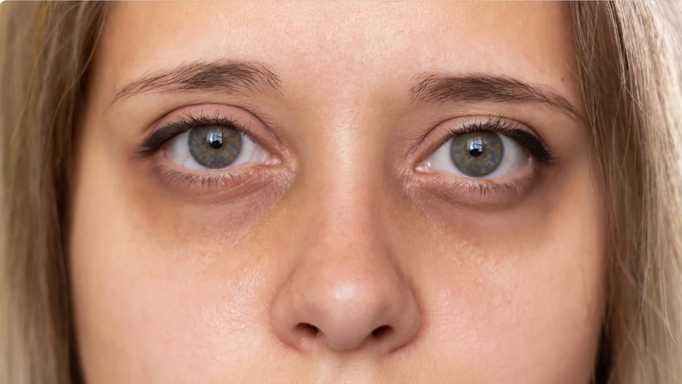 黒クマ | 皮膚のたるみ・眼窩脂肪の突出 | 光の影でくぼみが強調される。 |