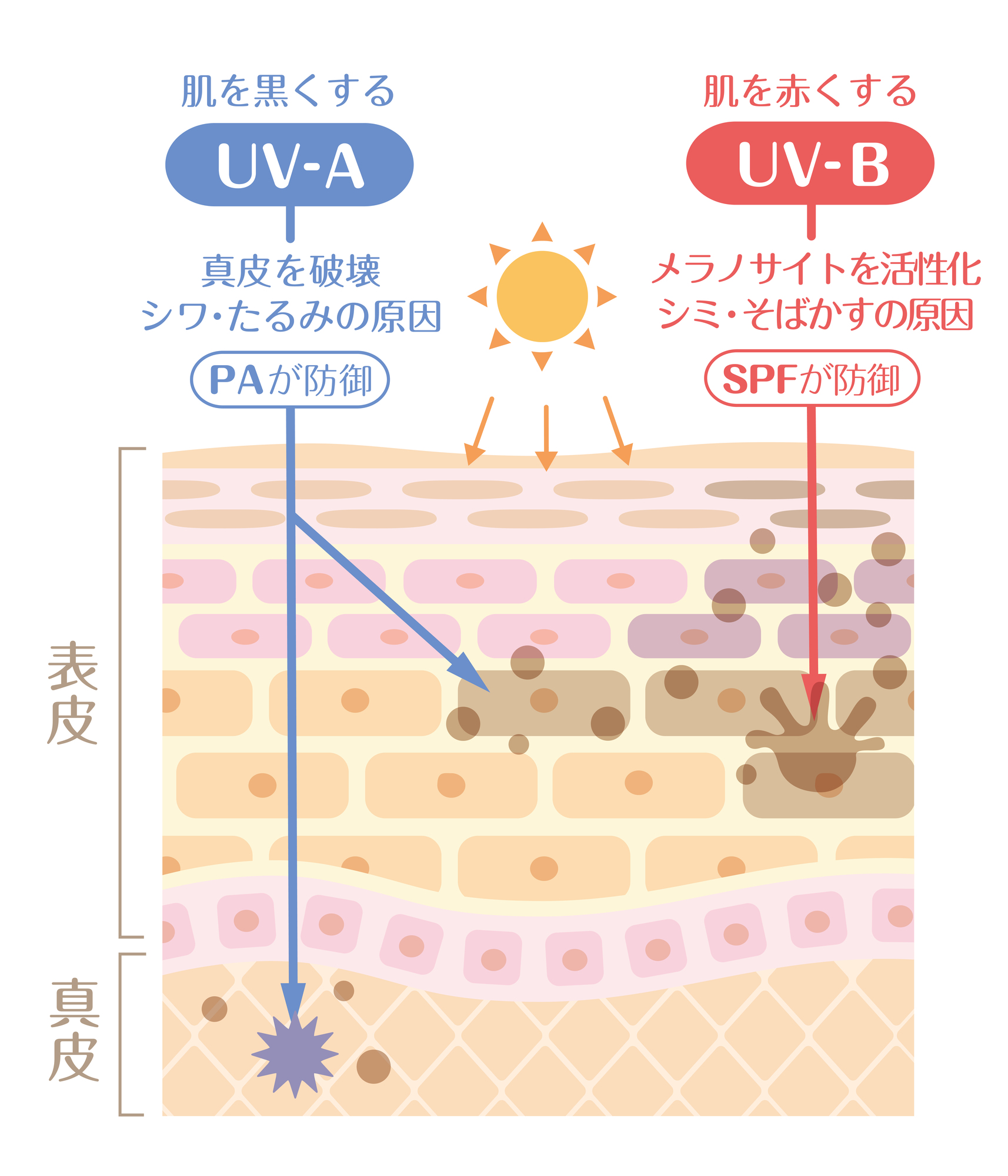 SPF | UVB | 皮膚の赤み、炎症、水ぶくれといった表面的なダメージ | 数値(1〜50+) |
