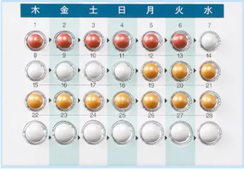 ③偽薬を全て飲み終わりましたら(7日休薬でもOK /この期間に出血が起こる)残っている錠剤の続きから服用開始ください。